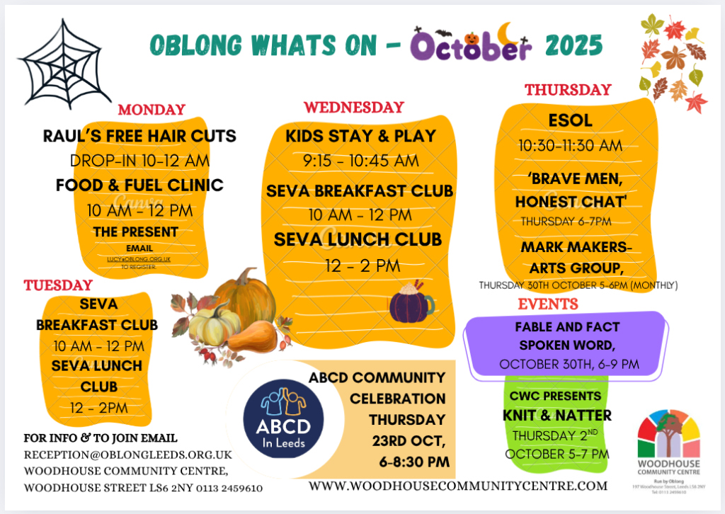 Contact lizzy@oblongleeds.org.uk or text/phone 07743 754724